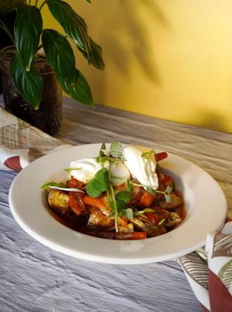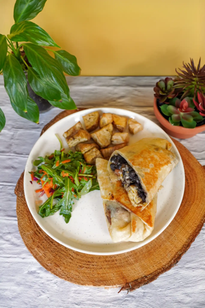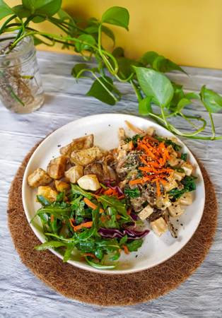 Organic Tofu, Bell Peppers, Onions Mushrooms + Kale Stir Friied In Tahini Soy Sauce Shredded Carrots , Sesame Seeds Served With Potatoes And Salad, Add Toast or Corn Tortillas + 1.5