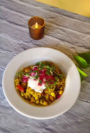Roasted Veg + Organic Quinoa Tossed In Fresh Turmeric Ginger, Coconut Curry, Two Poached Eggs + Pickled Cabbage