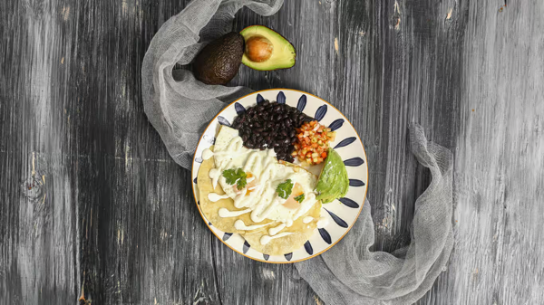 Two Sunny Eggs, Black Beans + Avocado Nested on Blue Corn Tortillas, Covered In Salsa Roja + Topped With Feta+ Sour Cream, Add Chorizo +4.5