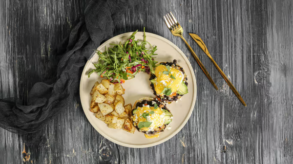 Two Sunny Eggs, Black Beans Cheddar, Pico De Gallo + Avocado, Nested on Blue Corn Tortillas With Sour Cream, Add Chorizo +4.5