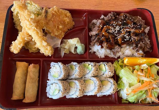 Beef teriyaki, California roll, tempura, and salad.