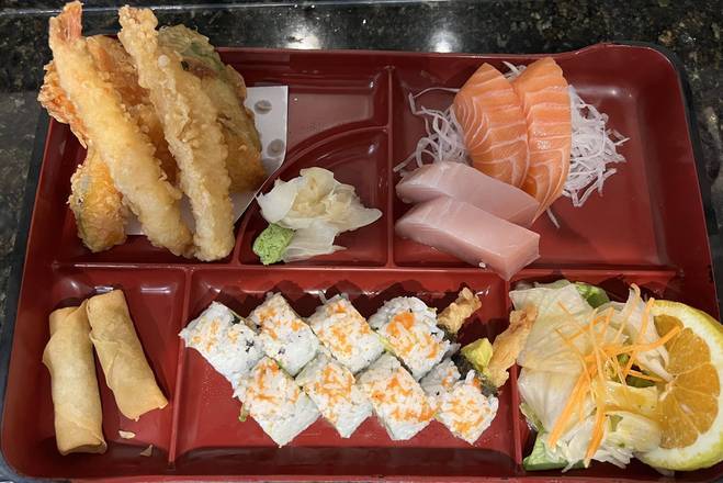 2pcs salmon sashimi, 2pes tuna sashimi.dynamite roll, tempura, salad