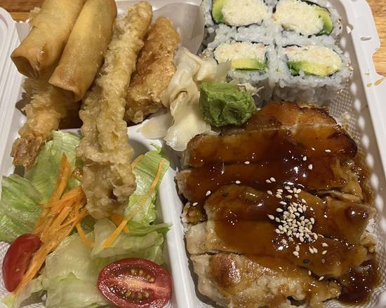 Chicken teriyaki, California roll, tempura, and salad.