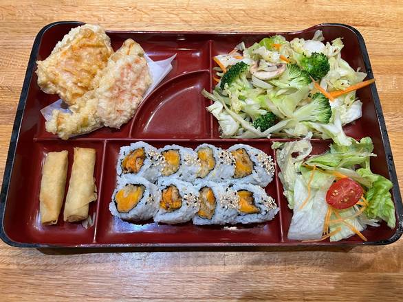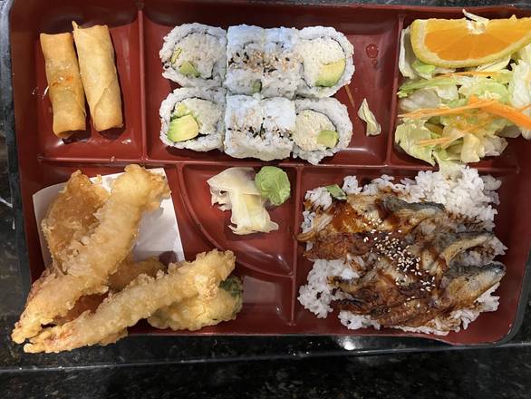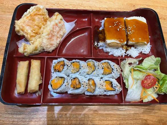 Salmon teriyaki, California, tempura, salad.