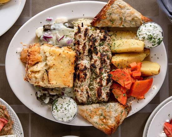 Featuring Greek Salad, Chicken Souvlaki(2 Skewers) Moussaka, Spanakopita(V) Dolmades Served With Rice, Roast potatoes, Vegetables, Satziki & Pita. Great for sharing.