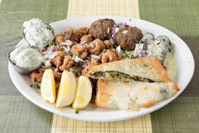 Combination of Calamaraki, Keftedes, Dolmades, Spanakopita(V), Satziki & Pita. Great for sharing.