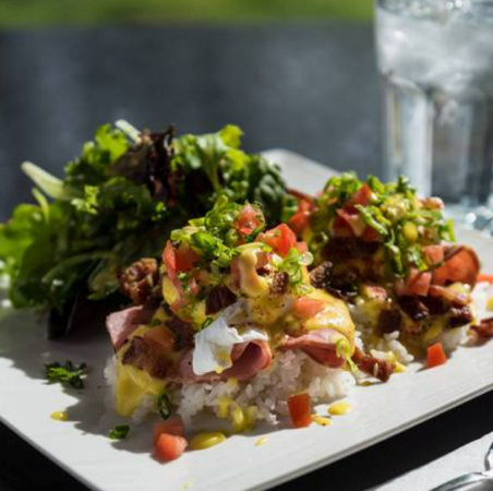 Ham, smoked bacon, tomato, green onion, with hollandaise . Served on a choice of rice or croissant with a side salad.