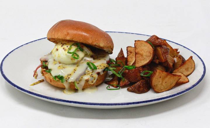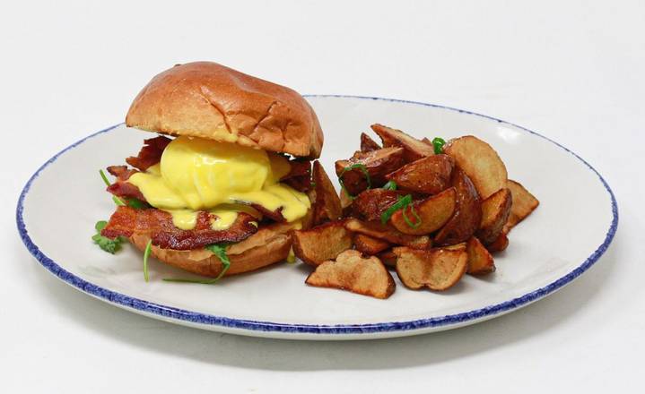 We've smashed a bunch of brunchy favourites together. A smash burger, melted American cheese, smashed tots, double smoked bacon, pickled red onions, a Perfectly Poached egg, real hollandaise, and a bit of spinach and arugula on a buttery brioche bun