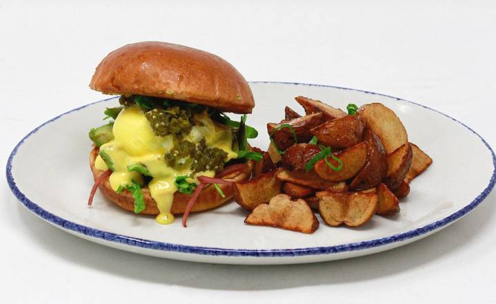 A spicy, buttery variation of the famous Nashville hot chicken. With Yolks-made bread and butter pickles, pickled red onions, butter lettuce, and our ranch on a toasted bun