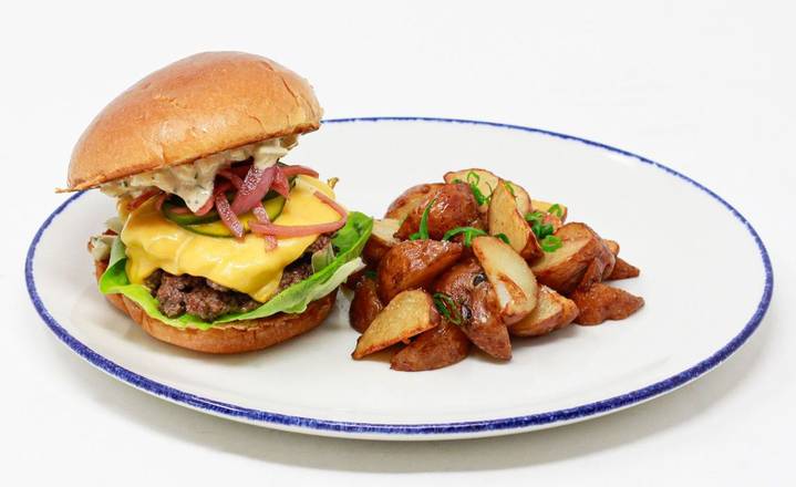 Two smashed organic chuck patties, special sauce, butter lettuce, American cheese, pickled onions and house pickles on a toasted brioche bun